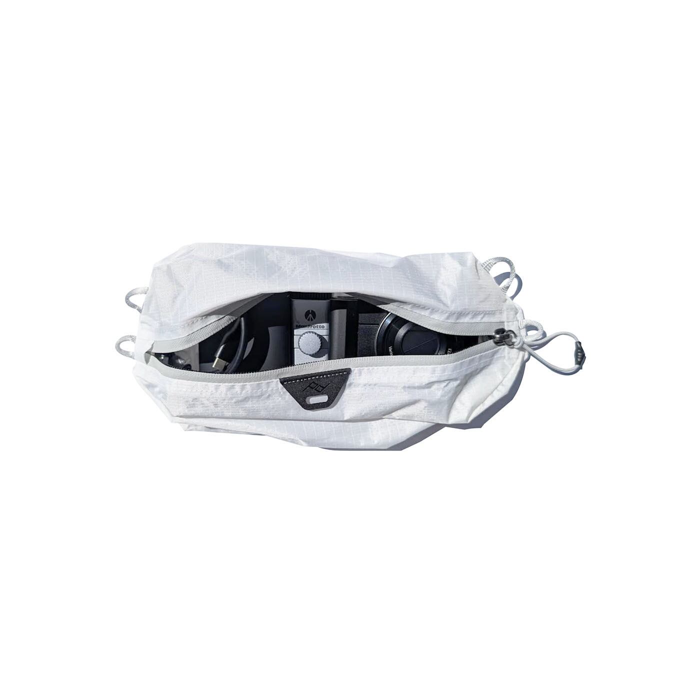 今回ご紹介するUltra Light Packing Cubeは、従来のパッキングキューブよりもさらに軽量化とシンプル化を進めたアイテムで、旅先や日常で必要な小物を効率的に整理できる仕様となっています。使用しない時には折りたたんでジッパーコードで留めれば手のひらサイズに収まり、ポケットやバッグの隙間に忍ばせておけるのも大きな特徴です。また、ポーチ上部には「コードフックループ」が備えられており、ストラップを取り付けることで、超軽量なスリングバッグとして活用できます。旅先でちょっと外出するときや、撮影の合間に必要最低限のギアを持ち歩くときなどに重宝する、汎用性の高いデザインとなっています。