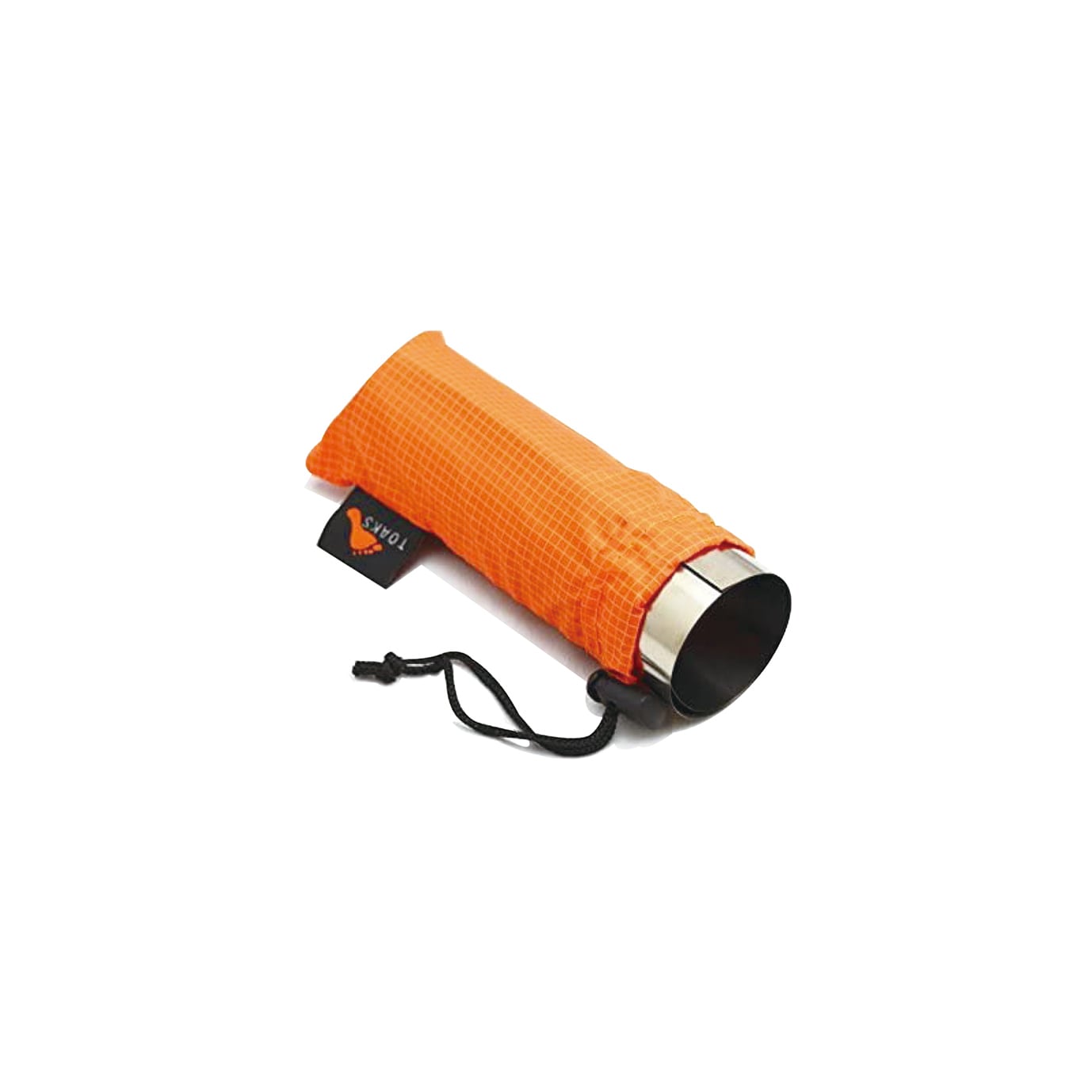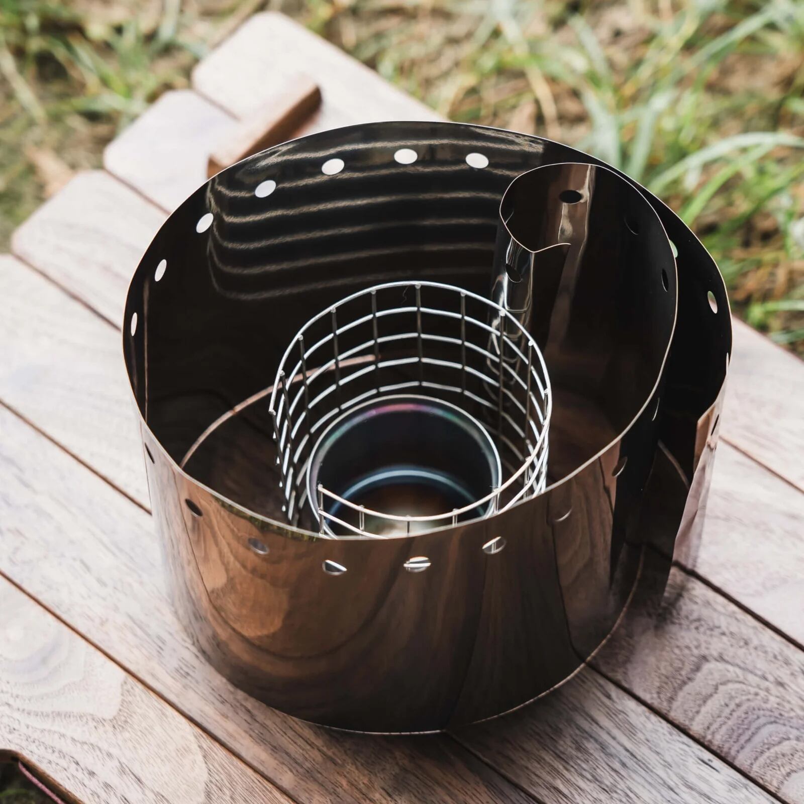 しかしアルミの風防は何度も使用していると素材自体が柔らかい為、折り目が付き、強度が不十分になり、ヘビー・ユーザーともなると使用してから1年と経たず新しいものに買い替えるケースが多いように思います。それに比べてチタンの風防は、アルミ風防に匹敵する軽さを持ちながら何度も何度も丸めて収納しても歪む事も無く何年とずっと使い続ける事が出来る強さと、地面に設置した状態で上から鍋を乗せてもひしゃげずに耐える強度を持っています。